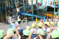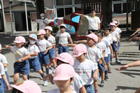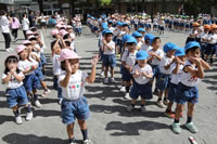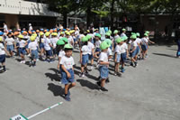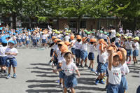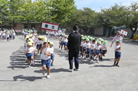 クラス名の書かれたプラカードを持って、お庭を行進してからたけのこ体操をしていきます。