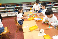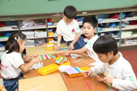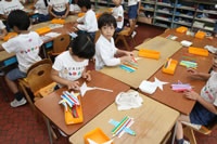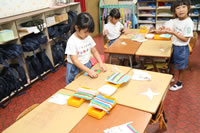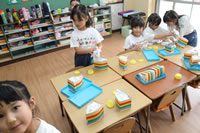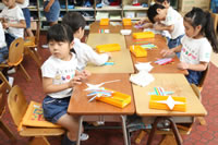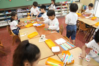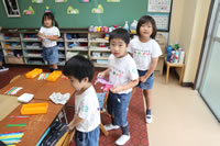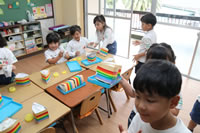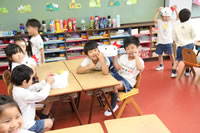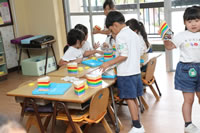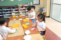 色紙やのりを使ってのおかいものごっこの売り物の制作など、様々な保育を行っています。
