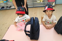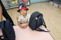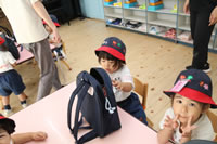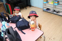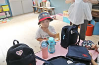 帽子をかぶってカバンにお手紙や道具をしまって水筒を持ってきたらしたく完了。