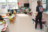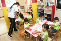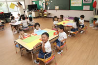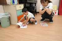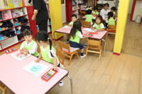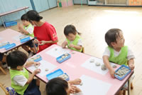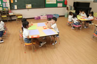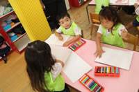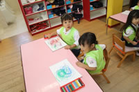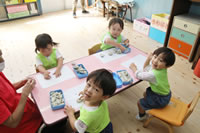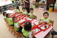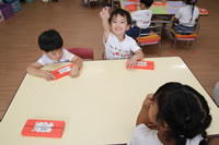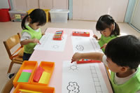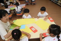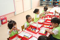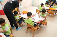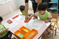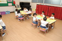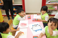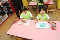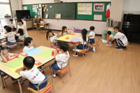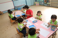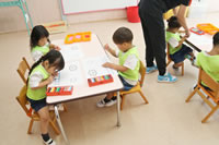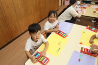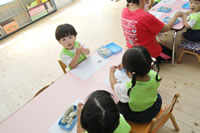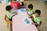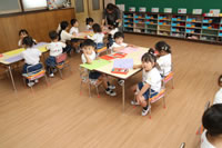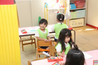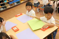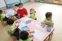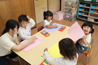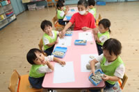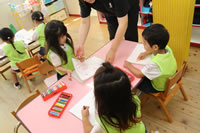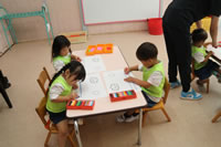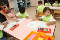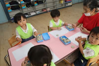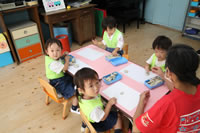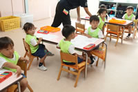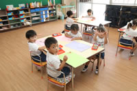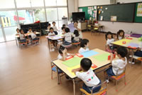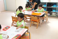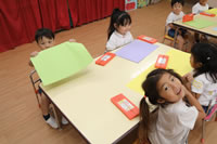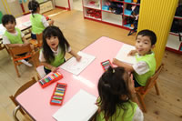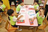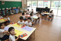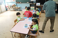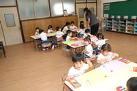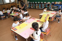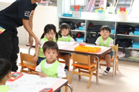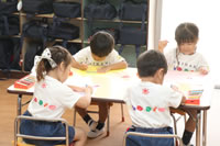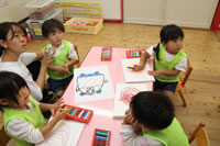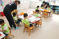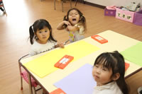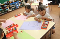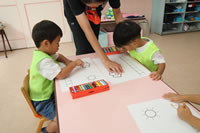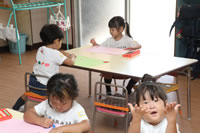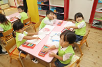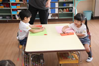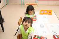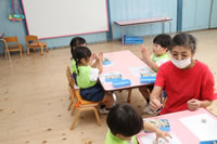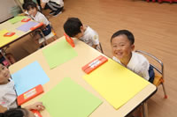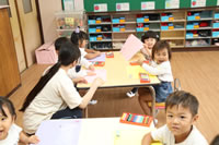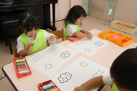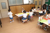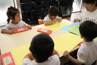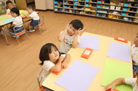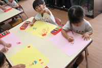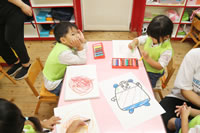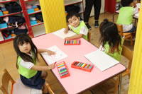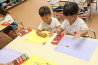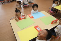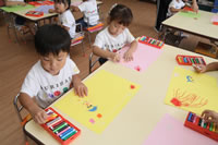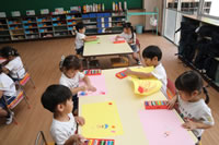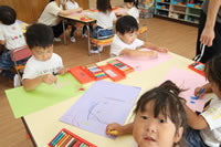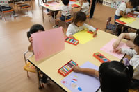 クレヨンで線と文字の遊びをしたり、色紙とのりで制作をしたりしているクラスもありました。