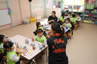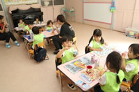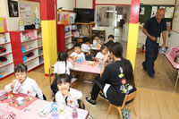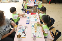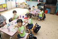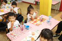 保育の後は給食の時間、今日のメニューはハムパンにヨーグルト、