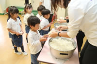 先日みんなが収穫した稲、そこから取り出したお米を少しだけ混ぜたあたたかいごはんに