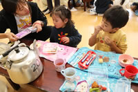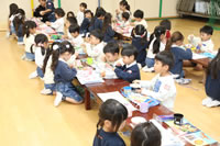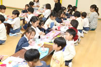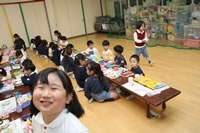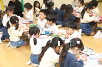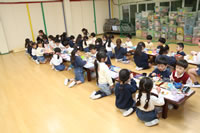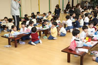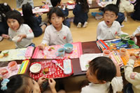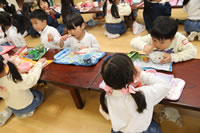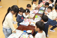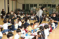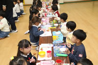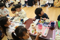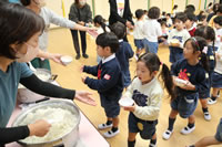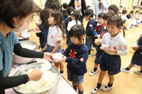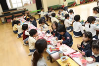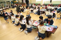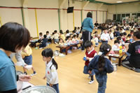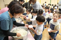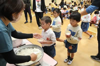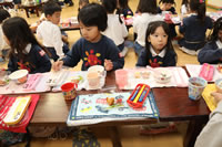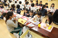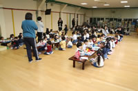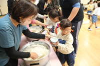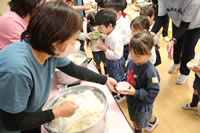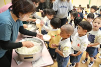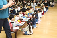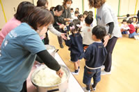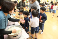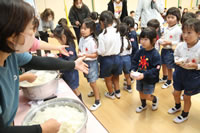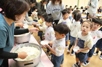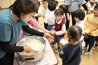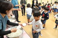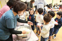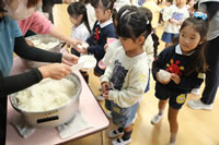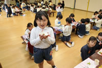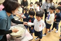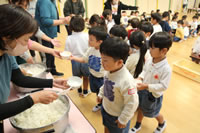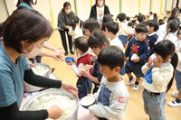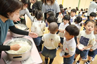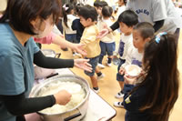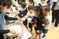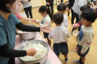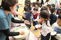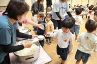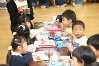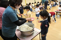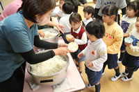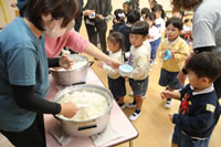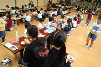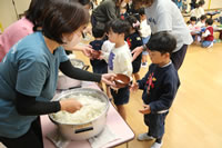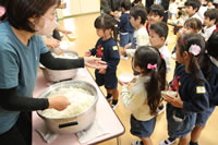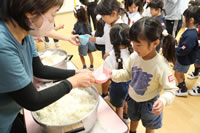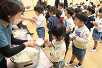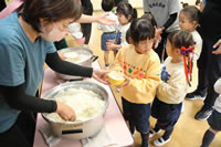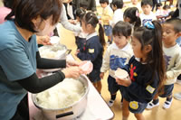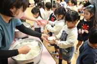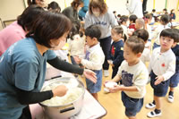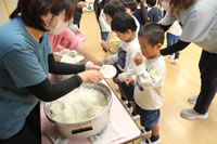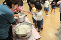 先日みんなが収穫した稲、そこから取り出したお米を少しだけ混ぜたあたたかいごはんにみんな大喜び、