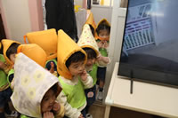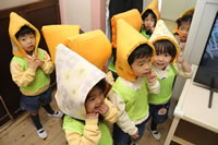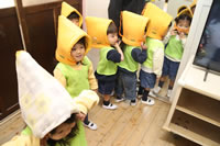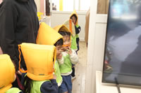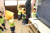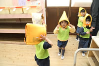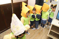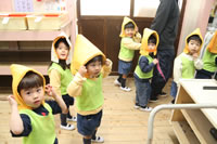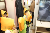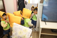 防災頭巾をかぶってみて、幼稚園の中を少し歩いて回りました。